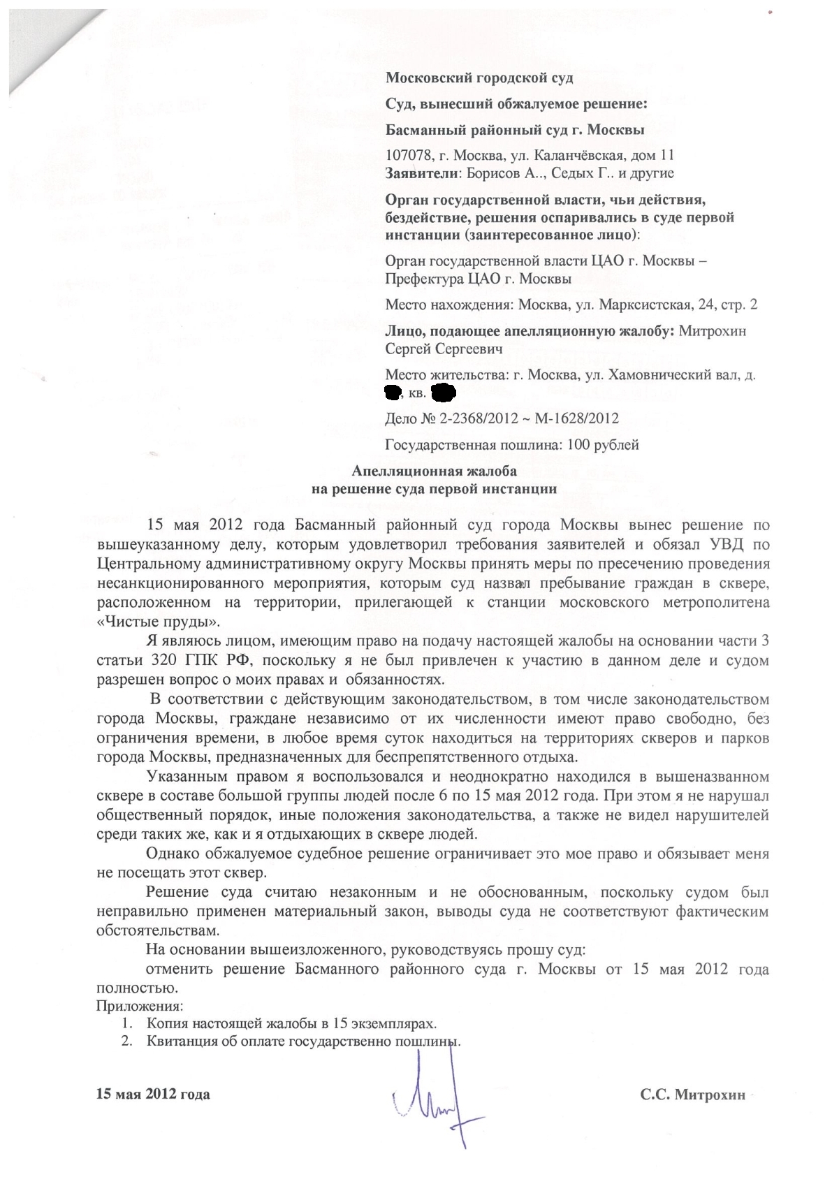 Лидер партии «ЯБЛОКО» Сергей Митрохин обжаловал в Мосгорсуд сегодняшнее решение Басманного суда столицы о ликвидации лагеря оппозиции в сквере на Чистопрудном бульваре.
