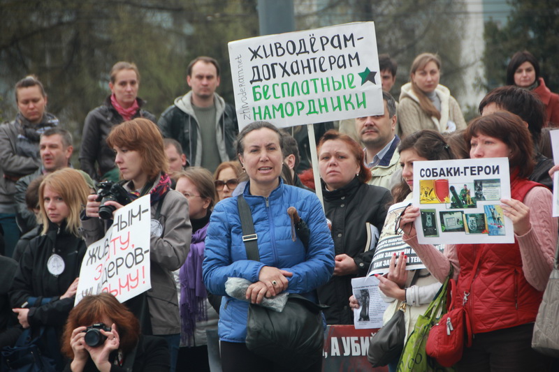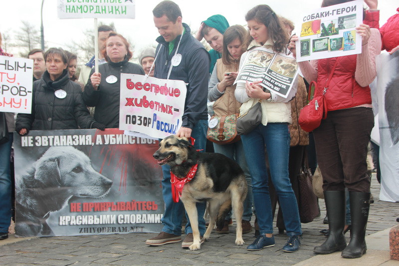 Многие участники московской акции вышли на площадь со своими питомцами – собаками, кошками и даже хорьками. Некоторые из них в свое время пострадали от рук живодеров – лишились лап, глаз. Практически у каждого митингующего был свой плакат, многие держали в руках фотографии своих собак, убитых догхантерами.