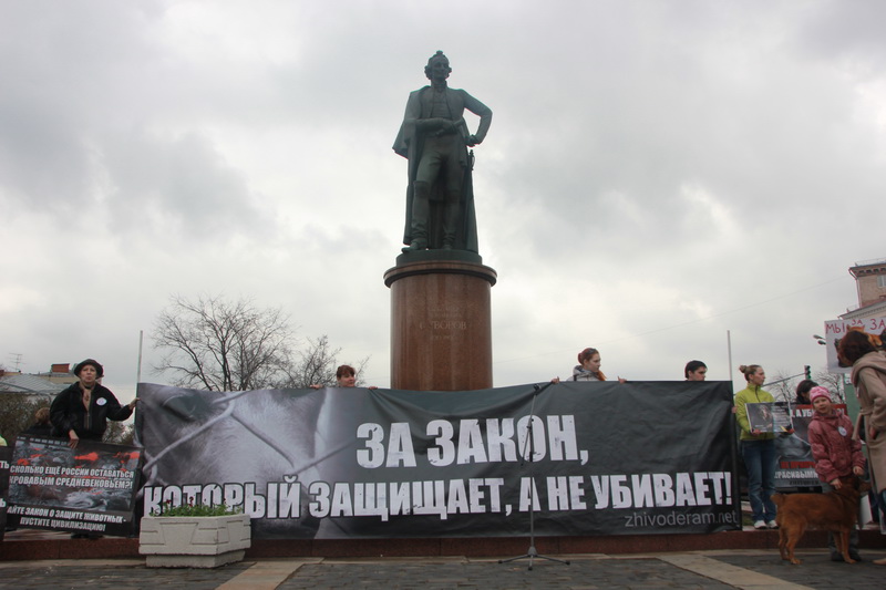 Более 500 человек собралось на митинг против жестокого обращения с животными, который прошел сегодня на Суворовской площади в Москве. Участники акции протестовали против закона «Об ответственном обращении с животными», под руководством депутата Шингаркина превратившегося из зоозащитного в живодерский. Акция прошла при поддержке партии «ЯБЛОКО».