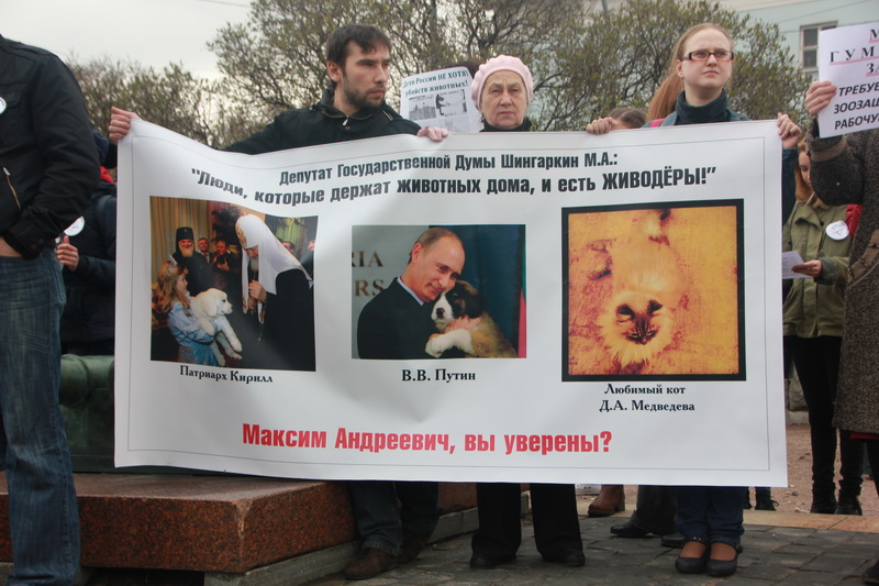 Организаторы митинга озвучили данные социологических опросов, по которым только 8% россиян считают уничтожение бездомных животных допустимым. И именно эту позицию позволяет себе отстаивать депутат Шингаркин, отмечали выступающие.