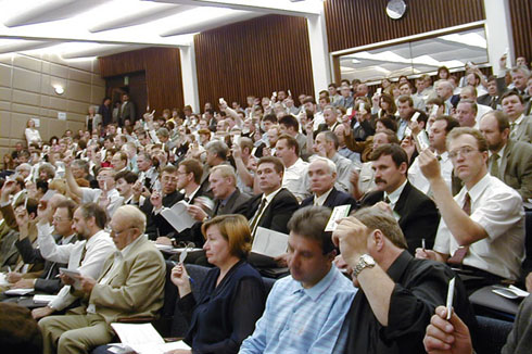 Григорий Явлинский переизбран председателем Объединения "Яблоко". Такое решение принято на прошедшем 8 и 9 июля 2000 г. VIII отчетно-перевыборном съезде Объединения. В ходе тайного голосования за кандидатуру Г. Явлинского высказались 128 делегатов, против - 10. Первым заместителем переизбран Владимир Лукин (119 за, 19 против). На съезде присутствовали 140 делегатов из 57 региональных организаций. Съезд решил учредить при Объединении Общественный совет для привлечения к работе "Яблока" представителей общественных и профессиональных организаций и установления диалога с общественностью. Также создан Комитет гражданского контроля, который будет следить за соблюдением органами власти прав и свобод человека и гражданина. Будет образована сеть общественных приемных "Яблока". VIII съезд "Яблока" утвердил новую структуру управления Объединением, согласно которой Центральный Совет (ЦС) - руководящий орган в перерыве между съездами - будет состоять из 60 человек. На прошедшем съезде избраны 47 его членов, довыборы в этот орган пройдут на очередном съезде в декабре 2000 г. Каждое из направлений деятельности Объединения будет возглавлять секретарь, выдвинутый председателем и утвержденный ЦС. На данный момент определено 8 таких направлений: партстроительство, работа в Госдуме, выборы, взаимодействие с органами власти, идеология, информационная политика, связь с общественностью, общепартийные проекты. Будет также работать партийный арбитраж, программная и кадровая комиссии. См. также: Фотографии со VIII съезда "Яблока"