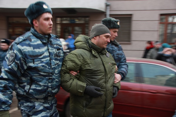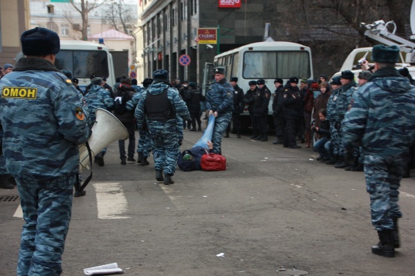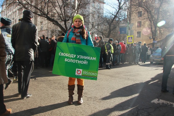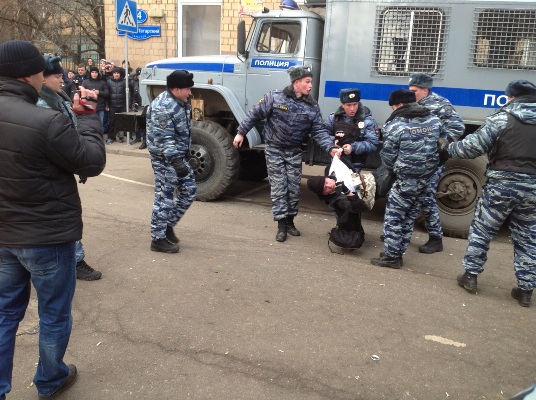 Софья Русова стояла в одиночном пикете (совершенно законно) и задержана не была. Но вслед за ней этот же плакат взял Юрий Тюрин из Молодежного ЯБЛОКА – и тут же был задержан