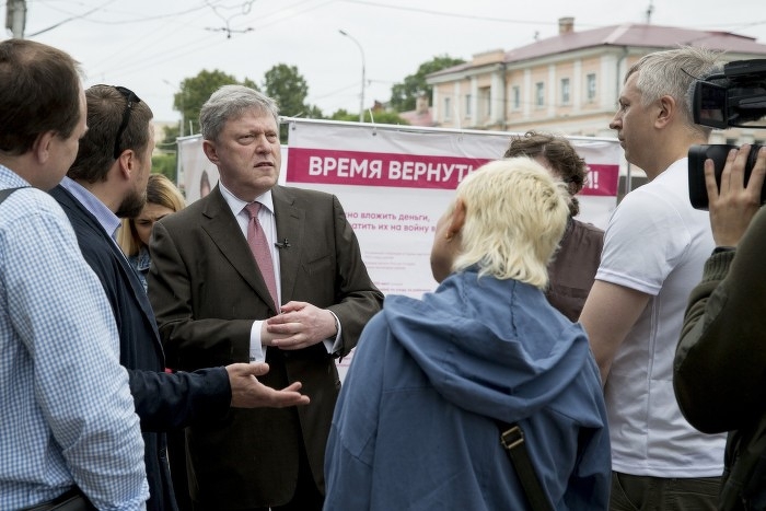 На фото: Григорий Явлинский в Рязани во время антивоенной кампании «Яблока» «Время вернуться домой», посвященной необходимости вывода российских войск из Сирии. 2017 год.