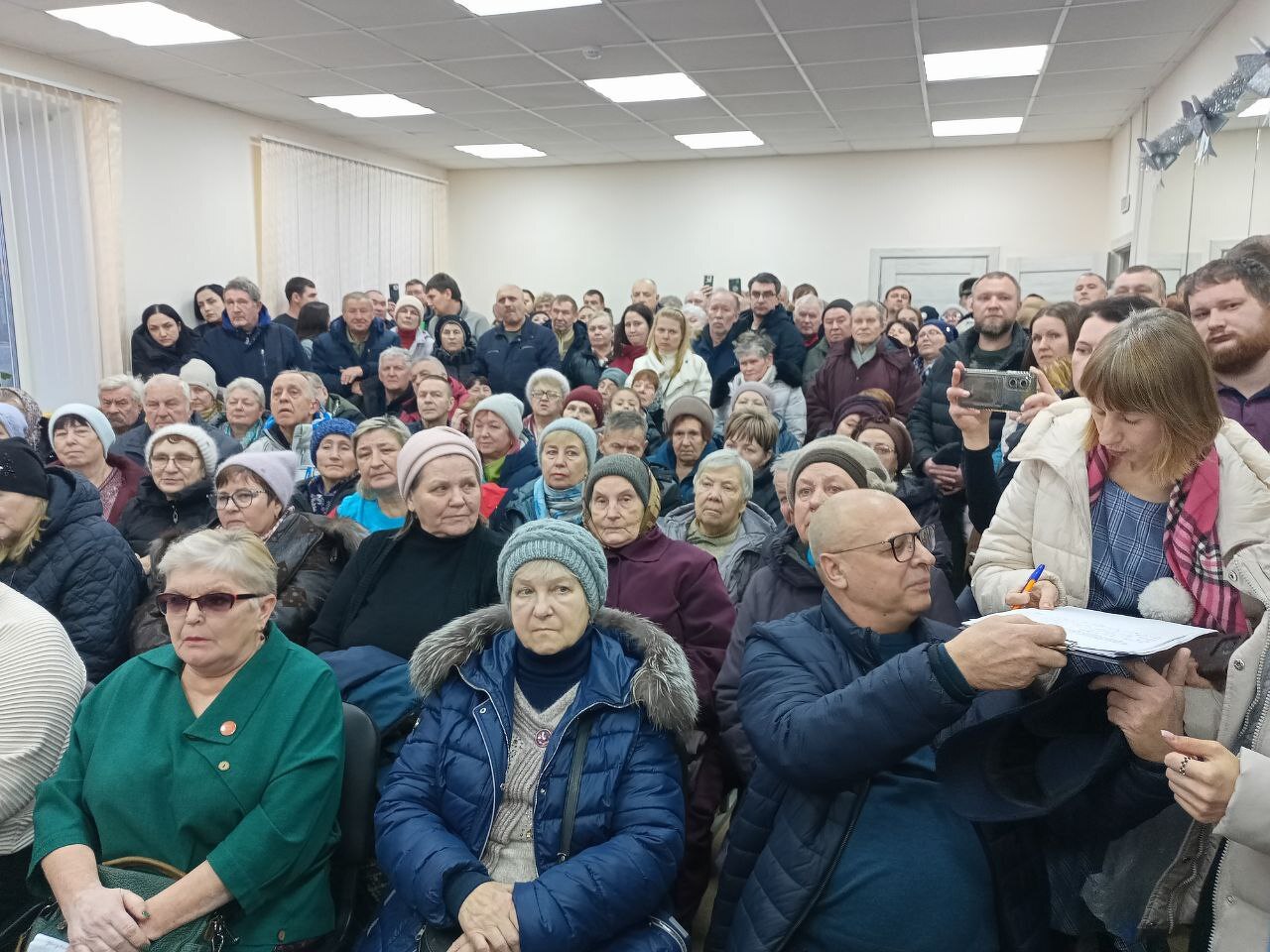 Жители Дубровического поселения на публичных слушаниях 18 января 2025 года. Зал не смог вместить всех желающих высказаться против ликвидации местного самоуправления. Фото: «Vidsboku»
