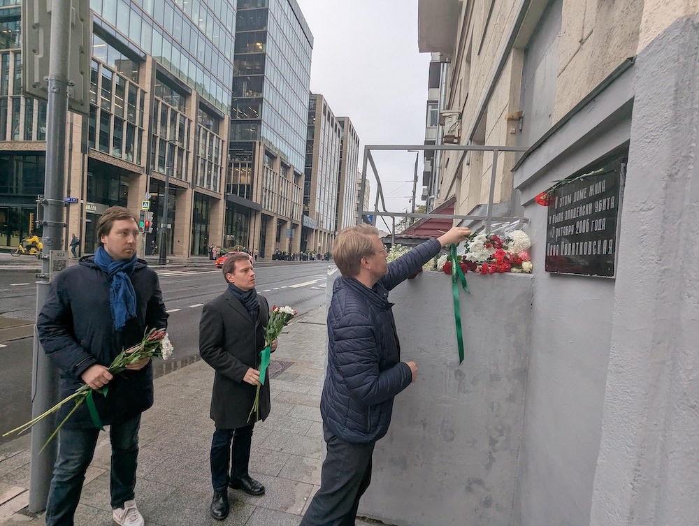 Кирилл Гончаров, Иван Большаков и Николай Рыбаков возглагают цветы к мемориальной табличку у подъезда, в котором была убита Анна Политковская. Фото: пресс-служба партии