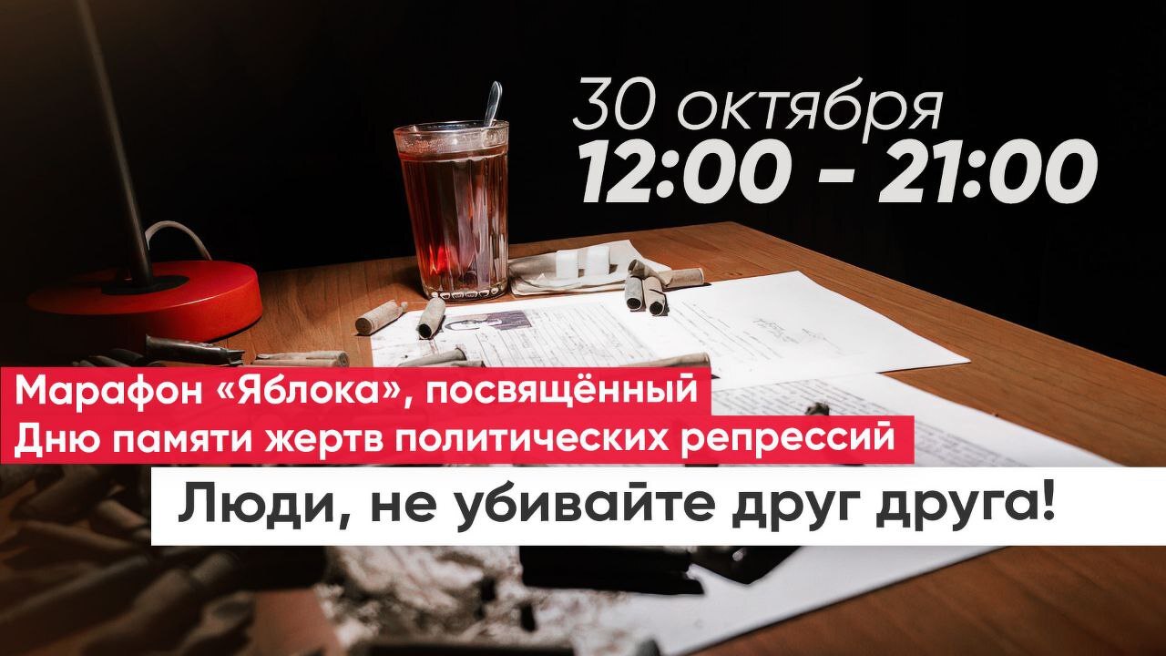 Марафон «Люди, не убивайте друг друга!» партия «Яблоко» проводит уже в третий раз. С тех пор, как ежегодное чтение имён очно власти запретили сначала в Москве, а затем и в регионах, акция перешла в онлайн-формат и закрепилась как новый способ почтить память всех жертв политических репрессий. Во время марафона партийцы и гражданские активисты, сменяя друг друга, будут читать имена людей, расстрелянных в городах нашей страны в годы государственного террора.