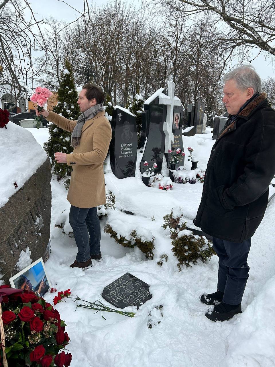 Руководитель Федерального политкомитета «Яблока» Григорий Явлинский и председатель московского «Яблока» Кирилл Гончаров принесли цветы к могиле Бориса Немцова на Троекуровском кладбище в Москве.