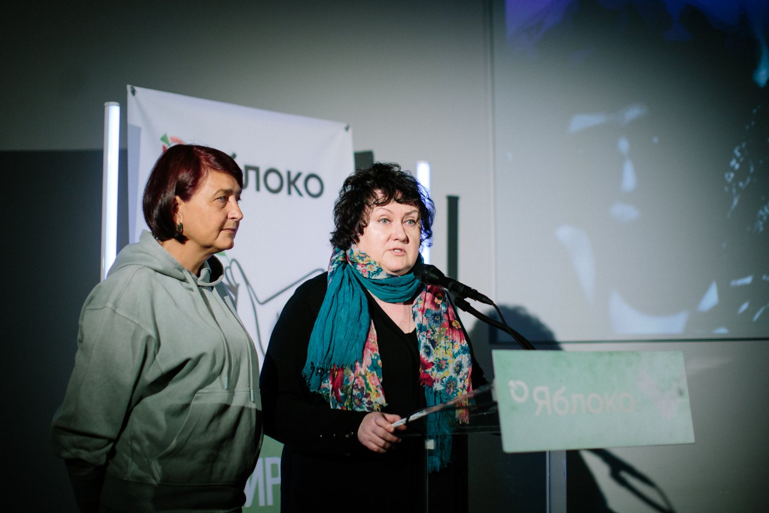 К трибуне вышел председатель «Яблока» Николай Рыбаков. Он открыл презентацию фильма и напомнил собравшимся о цели каждого мероприятия партии – особенно в последние четыре года – помочь людям нерасчеловечиться и приблизить мир.