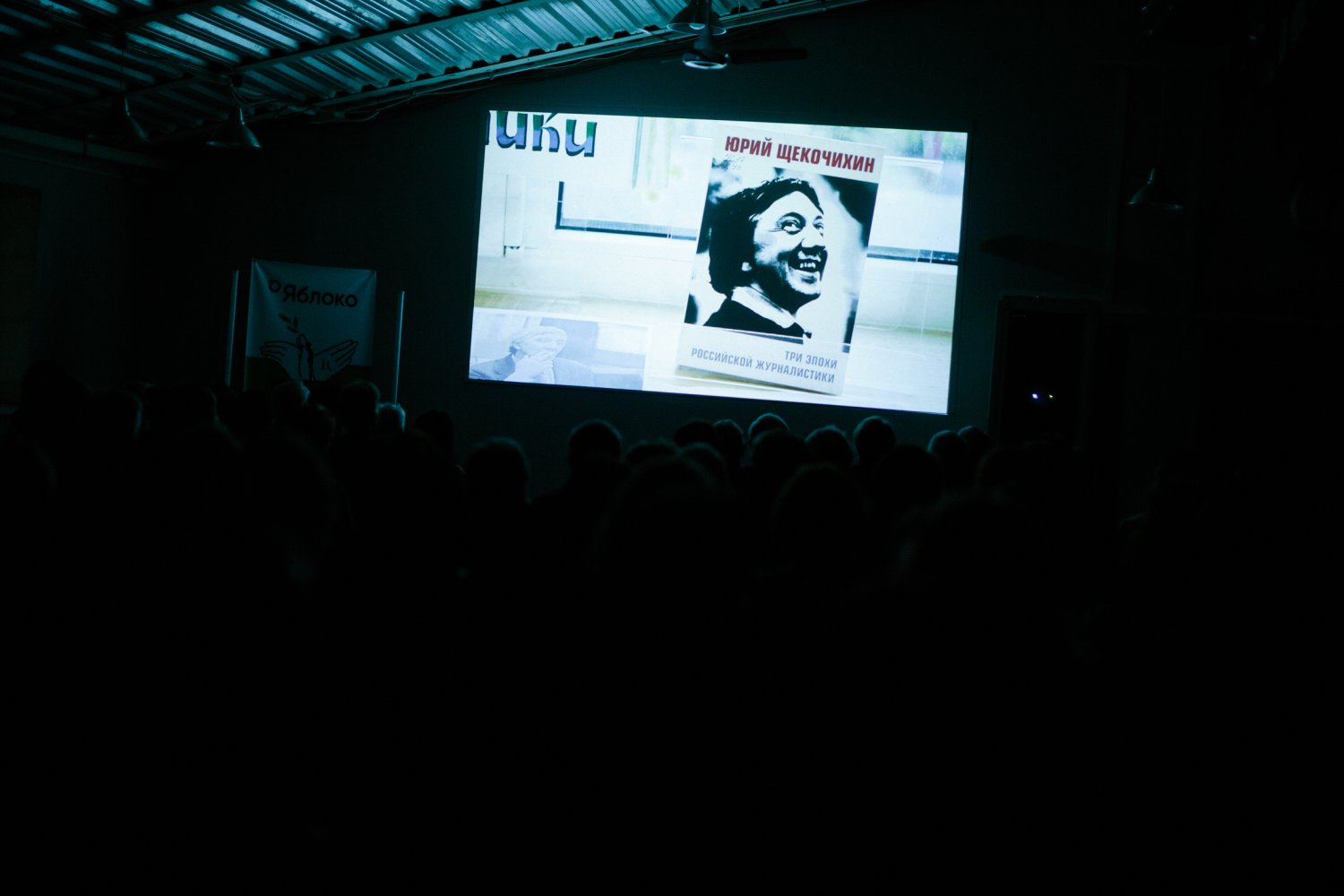 Десятки друзей Юрия Щекочихина, коллег-журналистов – и по «Новой газете», и по цеху вообще – сослуживцев по театру, соратников по «Яблоку», противников по Госдуме, учеников и совсем молодых, не заставших, но искренне любящих его наследие политиков и репортёров – в актовом зале офиса партии были, кажется, все. Мест не хватило, сидели на столах по периметру зала, стояли в проходах, теснились и радовались, что удалось попасть.