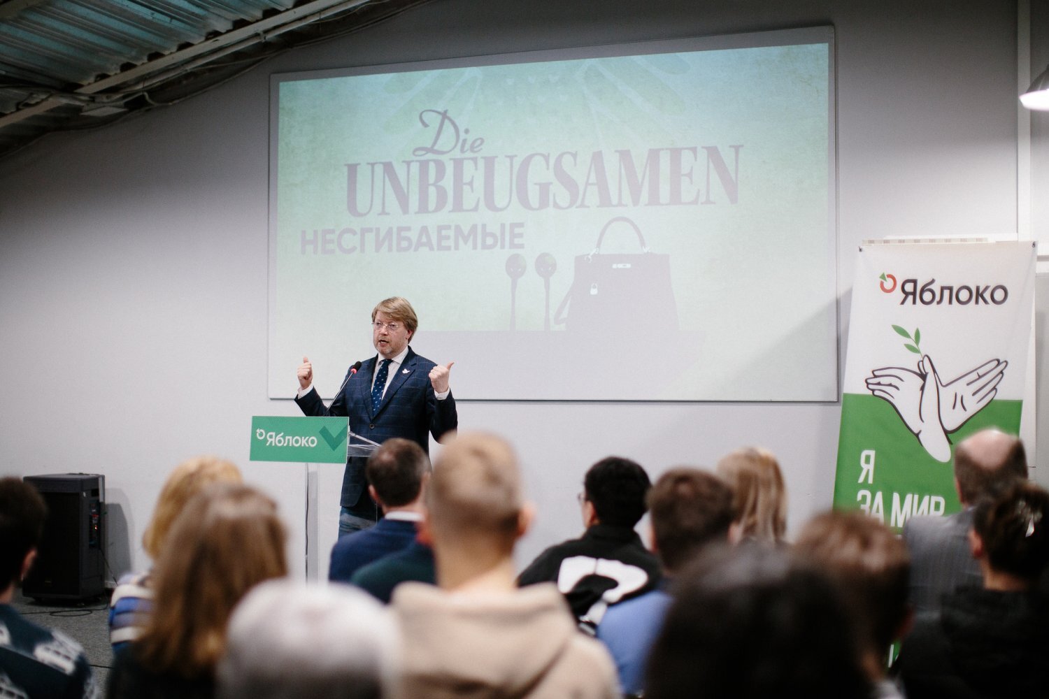 Открывая «яблочный» кинопоказ, член Федерального политкомитета партии, руководитель Аналитического центра «Яблока» Иван Большаков, рассказал о российском контексте, для которого очевидна связь с представленным немецким фильмом: