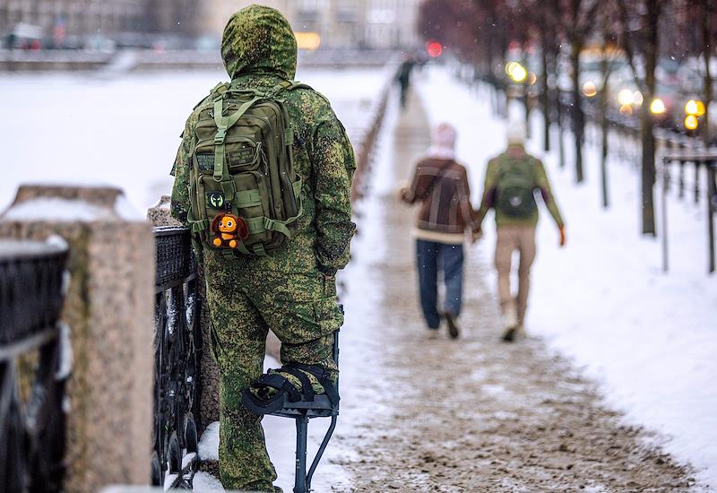 Военнослужащий на набережной в Петербурге. Фото: Екатерина Аболмасова/Коммерсантъ