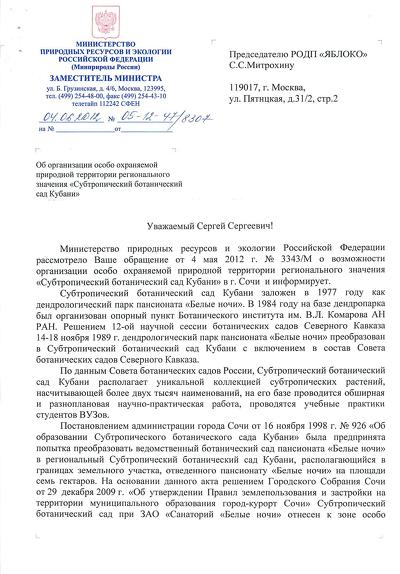 Минприроды признает экологическую и научную ценность Ботанического сада, а также юридическую уязвимость этой уникальной территории. Как следует из ответа заместителя министра Р.Гизатулина, вопрос о придании Ботаническому саду статуса ООПТ рекомендовано проработать совместно с администрацией Краснодарского края.