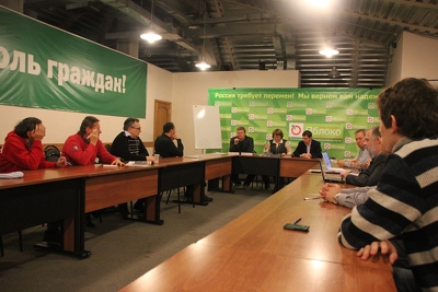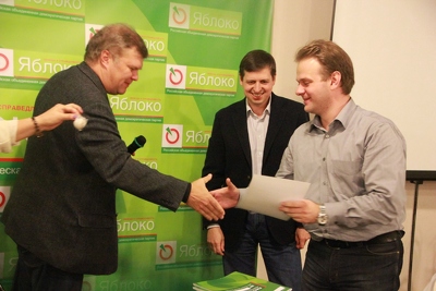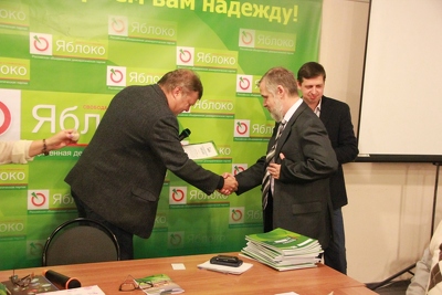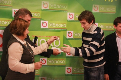 16 октября в офисе партии «ЯБЛОКО» прошла первая встреча с агитаторами. Лидер партии Сергей Митрохин, Первый Зампред Московского «ЯБЛОКА» Галина Михалева и Ответственный Секретарь Регионального Совета Михаил Петров поблагодарили участников встречи за продуктивную работу на выборах мэра и вручили им символические подарки.