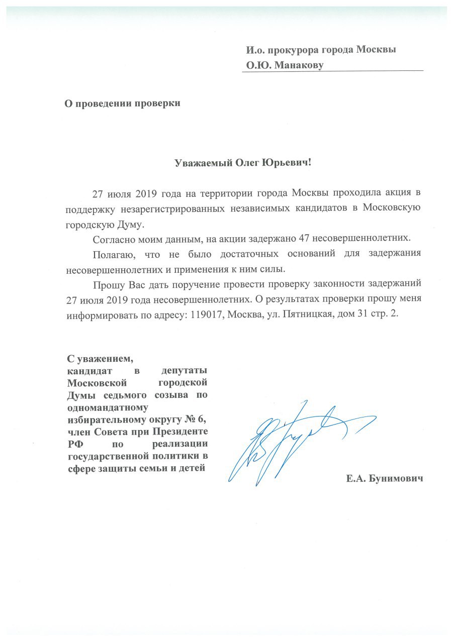 Уполномоченный по правам ребенка в Москве, зарегистрированный кандидат на выборы в Мосгордуму от партии «Яблоко», Евгений Бунимович обратился к начальнику ГУ МВД в Москве Олегу Баранову и исполняющему обязанности прокурора Москвы Олегу Манакову с просьбой проверить законность задержаний несовершеннолетних на митинге, прошедшем 27 июля 2019 года. На несогласованном митинге в поддержку незарегистрированных кандидатов от оппозиции, прошедшем в минувшую субботу, были задержаны 47 несовершеннолетних. Омбудсмен осудил применение насилия в отношении участников акции со стороны сотрудников правоохранительных органов.