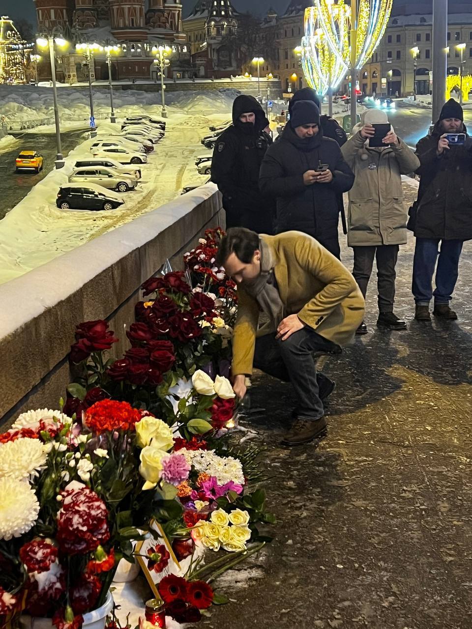 Председатель московского отделения партии Кирилл Гончаров на месте убийства Бориса Немцова в одиннадцатую годовщину трагедии