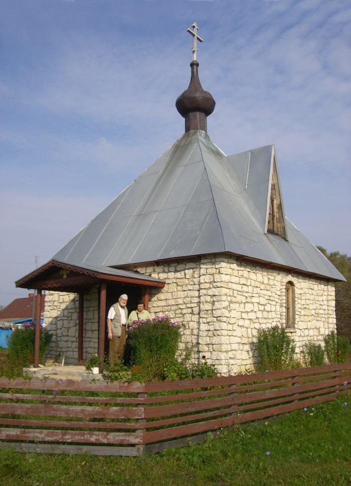 Алексей Яблоков с женой Дильбар Кладо в деревне Петрушово на крыльце построенной при его участии часовне