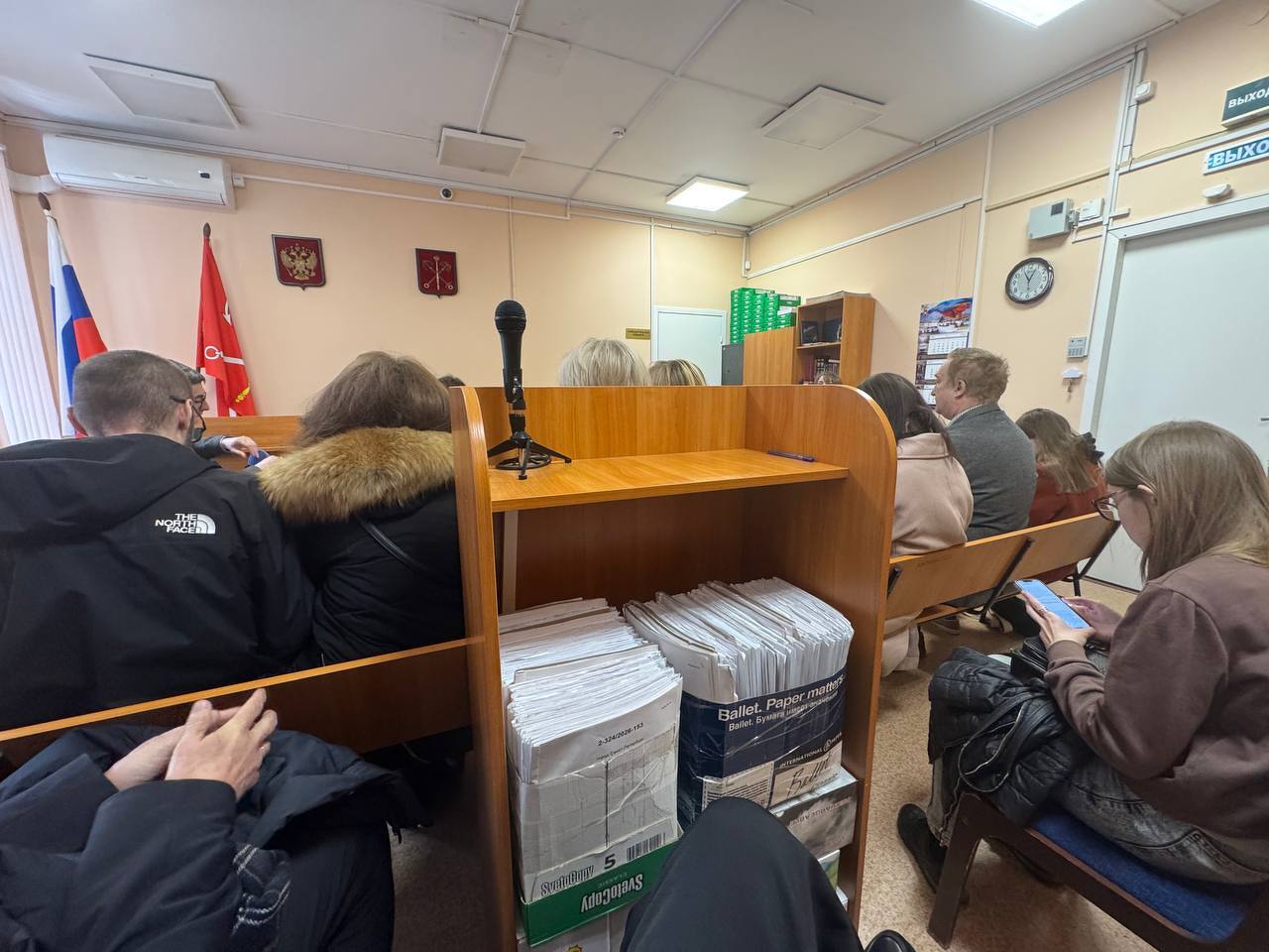 Заседание суда в четверг началось с ходатайства защиты о передаче дела по подсудности. Адвокаты аргументировали: место совершения правонарушения — это место его пресечения. Акт осмотра от 29 января 2026 года был составлен в Центре «Э» по адресу Рузовская улица, 8, что относится к судебному участку № 5. Судья удалился в совещательную комнату, но ходатайство отклонил.