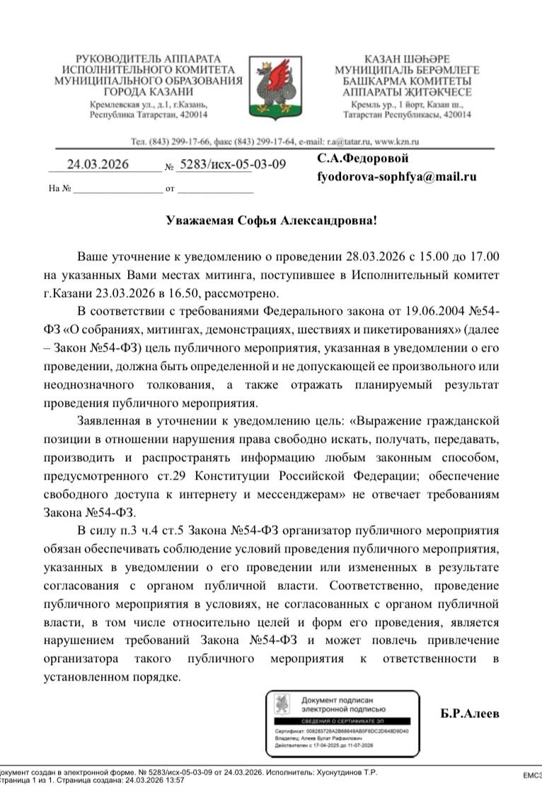 Исполком Казани уточнил свой отказ в согласовании митинга «Яблока» за свободу Интернета и против блокировок Telegram. Организатор акции – юристка и активистка партии Софья Фёдорова получила новое письмо администрации города вечером 24 марта.
