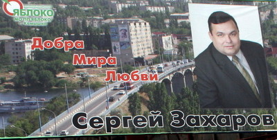 По договору с местной рекламной фирмой «Танис» «ЯБЛОКО» оплатило место для баннера и вывесило его около ДК «Текстильщик». На баннере, на фоне вида города помещён портрет известного публициста Сергея Захарова, в своё время сильно «провинившегося» тем, что колоритно исполнял роль «Арбузного царя» на популярном фестивале, будучи не той «политической ориентации». Текст баннера вполне безвинен: «Добра, мира, любви. Сергей Захаров». В углу ― зелёный партийный логотип.