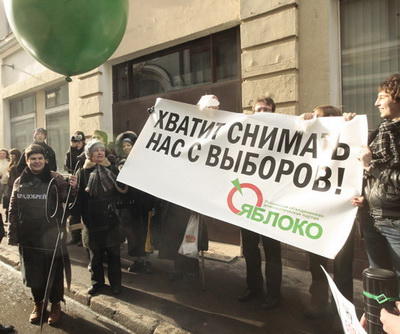 Активисты Молодежного «ЯБЛОКА» развернули напротив здания ЦИКа растяжку «Хватит снимать нас с выборов» и потребовали, чтобы ее председатель Владимир Чуров к ним спустился. «Яблочники» хотели напомнить Чурову о его клятве бородой, что выборы в России будут честными.