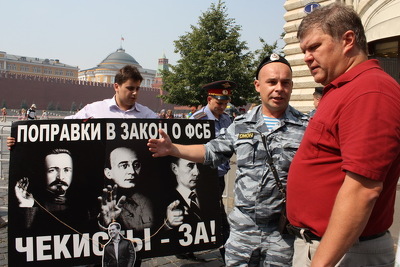Милиция задержала участника одиночного пикета на Красной площади и сломала плакат с изображением чекистов и марионетки Президента. Пикетчик был доставлен в ОВД «Китай-город». При разгоне акции предположительно сотрудники ФСБ попытались удалить снимки с камер журналистов, стереть их диктофонные записи и сломать видеокамеру.