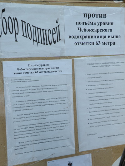 Нынешний уровень воды достигает 63 метров, местные власти планируют поднять эту отметку до 68 метров. «Такой проект рассматривался еще в советское время, и тогда от него было решено отказаться – ученые пришли к выводу, что от него будет больше вреда, чем пользы. Но это принесет выгоду областным властям – возрастет получение электроэнергии, снижения же цен для жителей не будет. А по оценкам экологов, это нанесет ущерб экологии Марий Эл и Нижнего Новгорода», - сказал на пикете председатель Нижегородского «ЯБЛОКА» Вячеслав Тараканов.